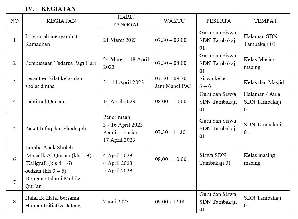 Dalam mengisi bulan Ramadhan, SDN Tambakaji 01 akan mengadakan berbagai kegiatan, sebagai berikut :